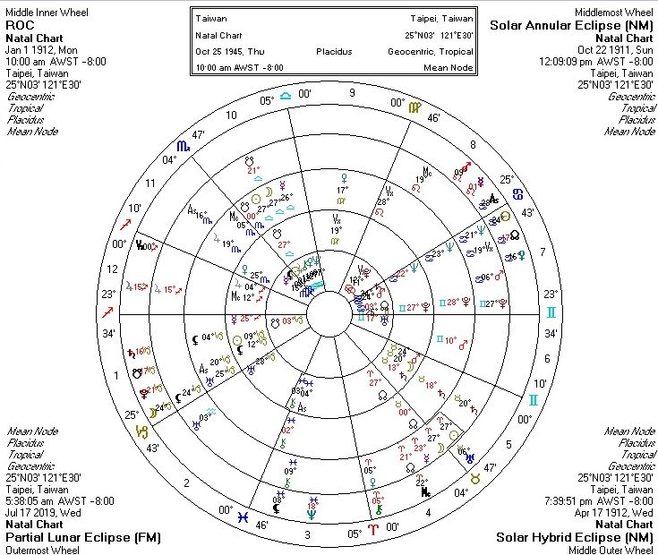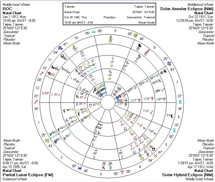 不過,與這個度數相關的日月食,經常會直接和第七宮(最內圈的)火星與土星緊密對分。只要任何關於中華民國體制的改革,都會衝擊到七宮的「公開的敵人」,並帶來衝突(火星)與限縮(土星)。就在這個日食發生後一個月,在李登輝的主導下通過了《國統綱領》。所謂的綱領,宣示意義大於實質效用,從此的實際狀況是兩岸的政治現實漸行漸遠。或許,任何發生在一宮與七宮敏感點的流年衝擊,都會帶來弔詭的結果:看似促進兩岸關係,實質上卻是分道揚鑣;看似劍拔弩張的對立,實質上卻又無法避免的緊密相關。